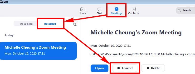 - Nếu quá trình chuyển đổi không thành công sau khi cuộc họp kết thúc, bạn có thể thử chuyển đổi lại các tệp bằng cách điều hướng đến vị trí ghi và nhấp đúp vào các tệp ghi.