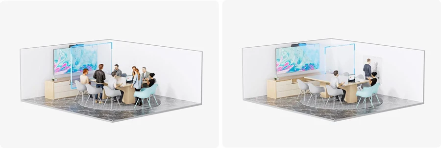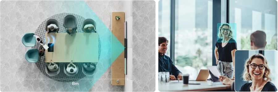 Đảm bảo đàm thoại tốt hơn với 6 micrô tạo chùm thông minh có tính năng thu giọng nói 8m. Với tính năng theo dõi người nói và khóa vị trí giọng nói, bạn và đồng nghiệp của mình luôn có thể trình bày rõ ràng quan điểm của mình. AGC duy trì đầu ra giọng nói liên tục và ổn định bất kể khoảng cách của người nói với micrô.