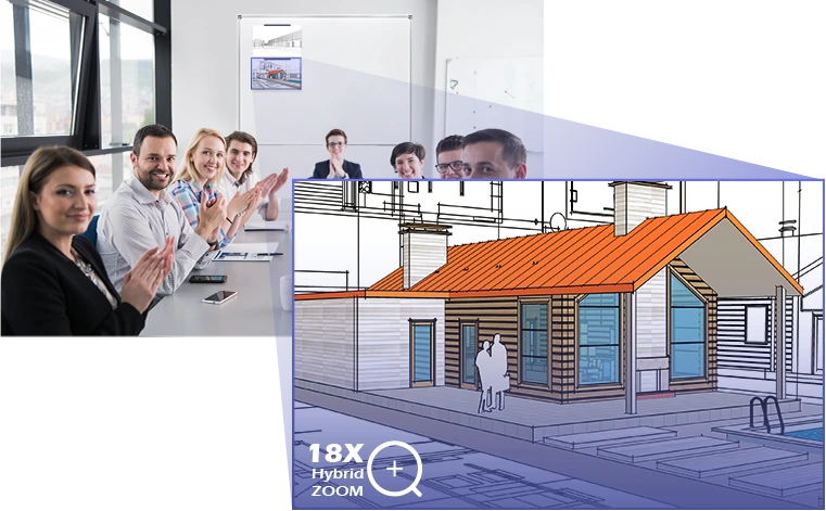 Nâng cao trải nghiệm cuộc họp video của bạn với AVer VB350 và công nghệ ống kính 4K kép. Với góc nhìn rộng 113° và zoom lai 18X, AVer VB350 ghi lại hình ảnh sắc nét của cả phía trước và phía sau trong các phòng họp lên đến 7 mét sâu.