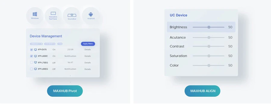 Sử dụng MAXHUB ALIGN để cập nhật và tối ưu hóa trạng thái của các thiết bị dành cho cuộc họp video của bạn, đồng thời tinh chỉnh hiệu suất máy ảnh để bạn trông đẹp nhất trong các cuộc gọi video. Thiết bị có thể được quản lý từ xa cho nhu cầu họp kết hợp của bạn thông qua MAXHUB Pivot.