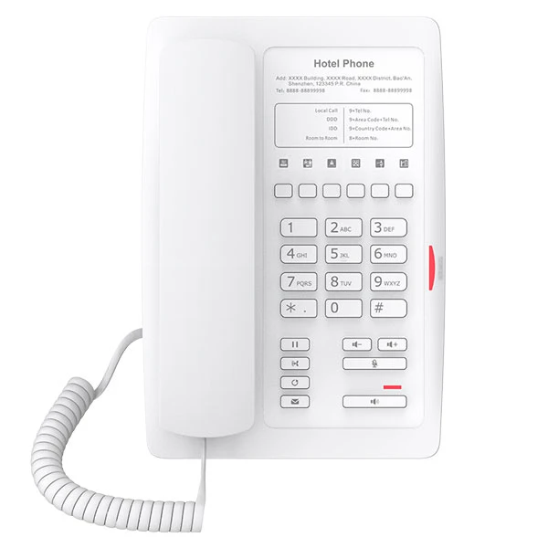 Fanvil H3 với hai màu có sẵn (trắng và đen) là sự lựa chọn tuyệt vời và giá cả phải chăng cho điện thoại IP khách sạn. Ngoài vẻ ngoài thanh lịch, Fanvil H3 còn được trang bị đầy đủ các chức năng: đường dây nóng dịch vụ, quay số nhanh, tin nhắn thoại, v.v.