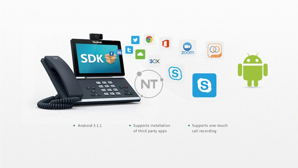 Dựa trên Android 5.1.1, Yealink SIP-T58V có trình duyệt, email, lịch tích hợp sẵn và hơn thế nữa. Quản trị viên có thể dễ dàng cài đặt các ứng dụng Android bổ sung để cải thiện sự cộng tác và năng suất. Trong khi đó, nó cung cấp cho bạn trải nghiệm hoạt động vượt trội, chẳng hạn như lên đến 3 chế độ xem màn hình nhàn rỗi riêng biệt, kéo để hội nghị và truyền tải, và tốc độ phản hồi nhanh hơn cho giao diện người dùng, v.v., tất cả đều làm cho việc cộng tác trở nên dễ dàng hơn bao giờ hết.