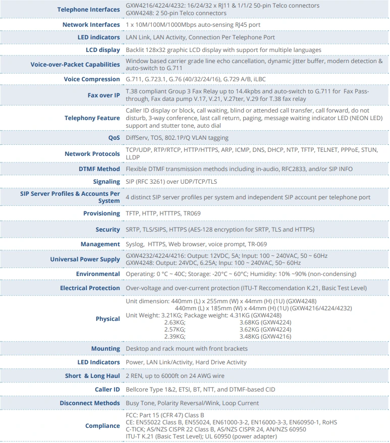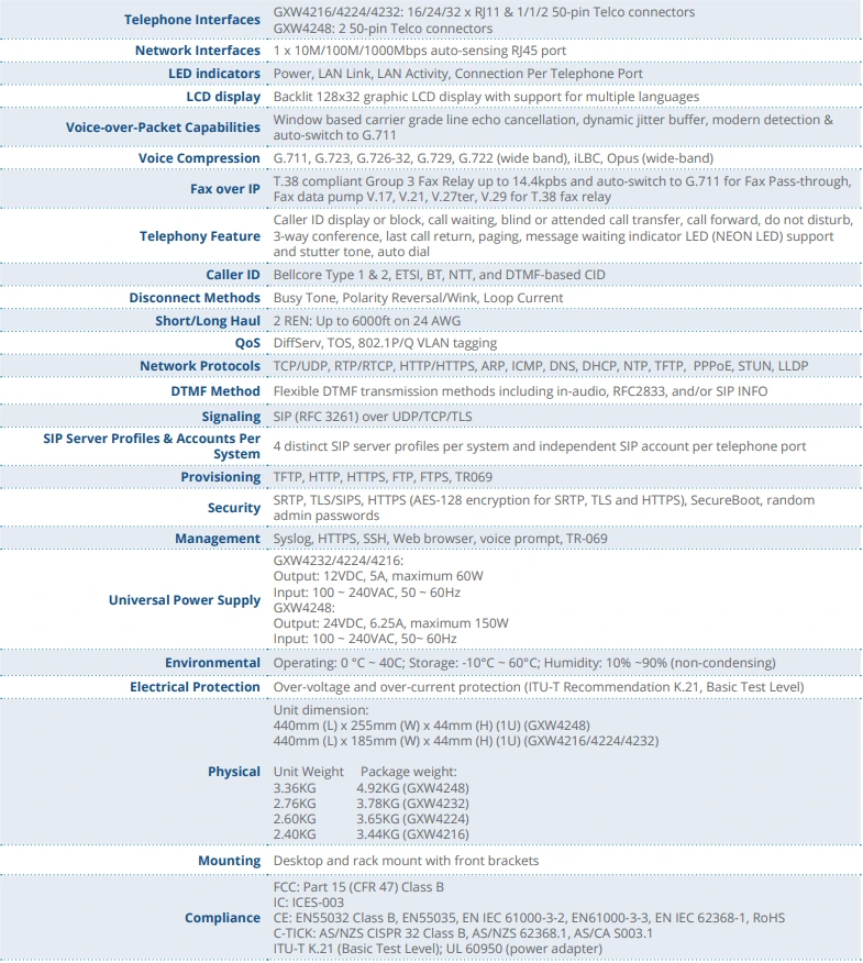 - 16/24/32 cổng FXS, GXW4248 gồm 2 đầu nối Telco 50 chân