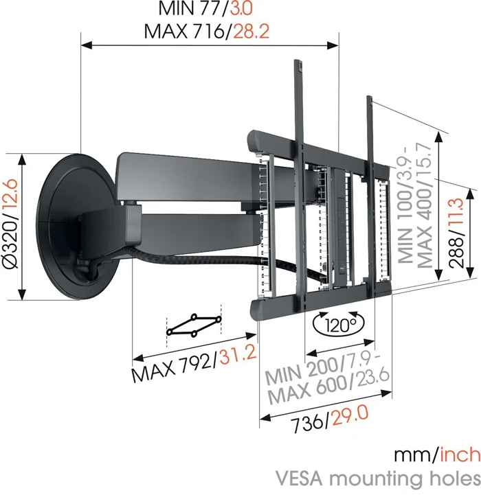 Nhờ cơ chế 4 tay cải tiến, giá treo tường Vogel’s TVM 7675 Pro có phạm vi di chuyển về phía trước lớn không dưới 72 cm. Điều này làm cho giá treo tường rất phù hợp để gắn trong tủ hoặc hốc tường trong văn phòng hoặc khách sạn.