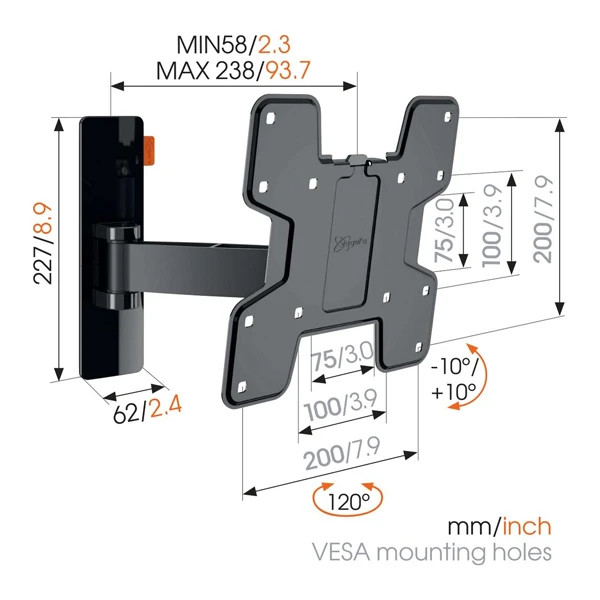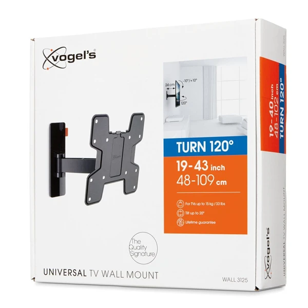 Vogel’s WALL 3125 là giá treo tường TV Full-Motion có trọng lượng tối đa là 15 kg. Hầu hết mọi kiểu TV, từ 19″ đến 43″ (48-109 cm), đều có thể được gắn lên tường với WALL 3125. Góc xoay tối đa là 120° và góc nghiêng tối đa là 20°.