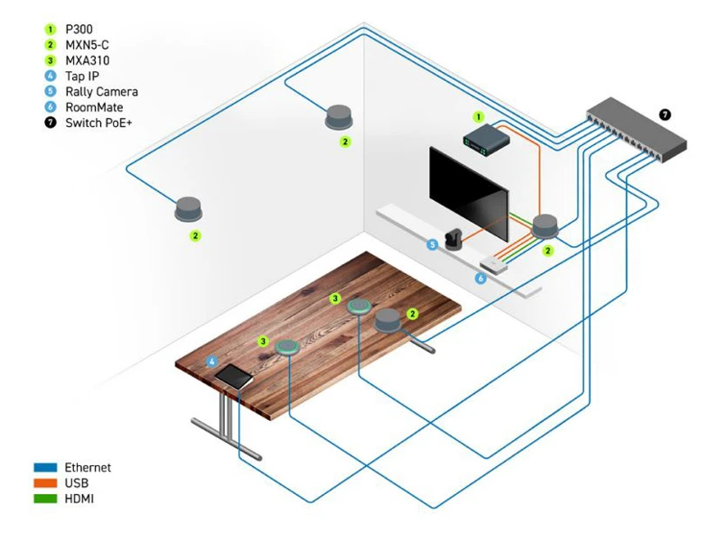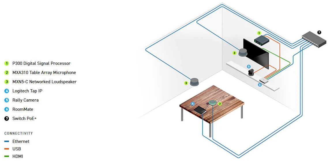 - Chức năng tắt tiếng của MXA310 được đồng bộ dễ dàng, không cần lập trình với App hàng đầu hiện nay như Zoom Rooms, Microsoft Teams và Skype for Business khi MXA310 được kết nối với Bộ xử lý hội nghị âm thanh IntelliMix P300 hoặc Giao diện mạng âm thanh ANIUSB-MATRIX