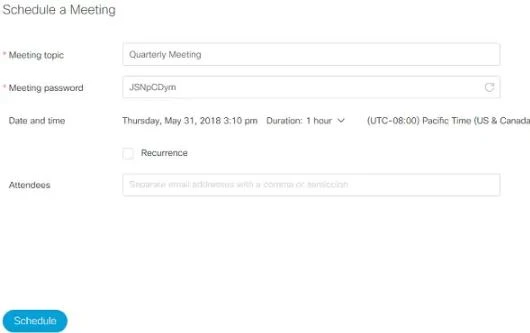 Đăng nhập vào trang Webex của bạn và chọn Schedule. Điền thông tin cuộc họp cần thiết và chọn Schedule.