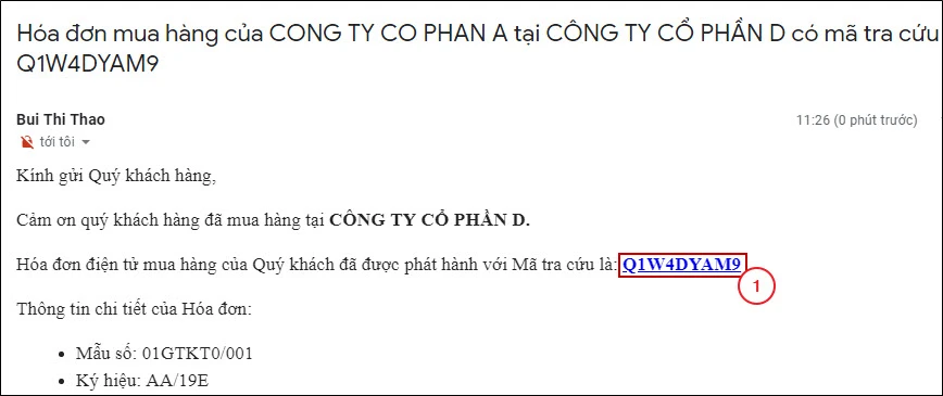 Cách 1: Bấm trực tiếp vào Mã tra cứu trên Email để xem Hóa đơn (Ghi chú: Cách này chỉ áp dụng cho trường hợp nhận Mã tra cứu qua Email )