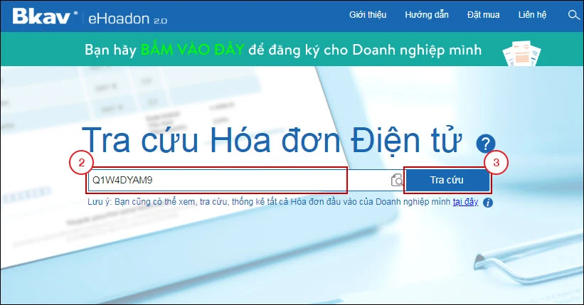 Bước 3: Trên giao diện Tra cứu Hóa đơn, nhập Mã tra cứu (1) tại bước 1 vào ô Nhập Mã tra cứu Hóa đơn (2), sau đó bấm Tra cứu (3).