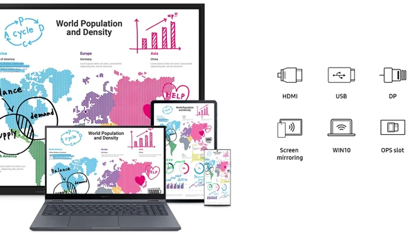 Samsung Flip 3 được trang bị nhiều tùy chọn kết nối linh hoạt như USB, HDMI, DP, OPS và chia sẻ màn hình không dây, đảm bào truy cập dễ dàng vào mọi nội dung từ bất cứ thiết bị nào. Hơn thế nữa, các giáo viên còn có thể tìm kiếm trực tiếp các nguồn giáo dục trực tuyến thông qua Samsung Flip 3 với hỗ trợ trình duyệt web.