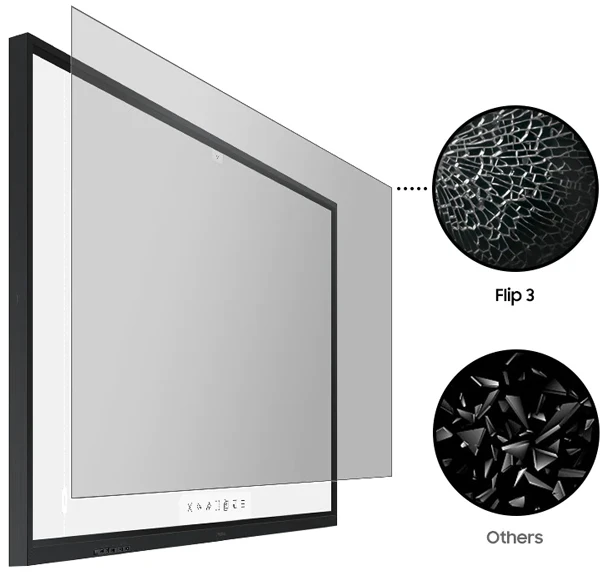 Chúng tôi hiểu rằng bất cứ lúc nào tai nạn cũng có thể xảy ra. Do đó nhằm bảo vệ toàn diện học sinh và giáo viên, Samsung Flip 3 được bao bọc bởi một lớp màng chống vỡ độc quyền từ Samsung, đảm bảo màn hình vẫn nguyên vẹn trong những trường hợp rơi vỡ hoặc va đập.