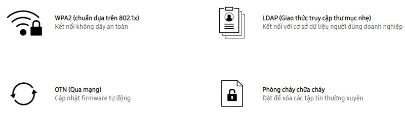 Với tính năng xóa tệp tự động và không dây an toàn, Samsung Flip WM55H đảm bảo một môi trường làm việc được bảo vệ. Các khả năng bổ sung của Samsung Flip WM55H bao gồm cập nhật chương trình cơ sở tự động và đồng bộ hóa LDAP khi được kết nối với cơ sở dữ liệu mạng để thuận tiện cho các cuộc họp chức năng.
