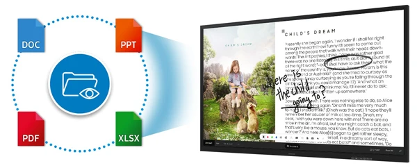 Người dùng có thể mở trực tiếp các tệp Microsoft Word, PowerPoint, Excel và Adobe PDF với trình xem tài liệu tích hợp sẵn trên Samsung Flip. Đảm bảo truy cập dễ dàng mọi nguồn nội dung, giúp cải thiện mức độ tham gia lớp học.