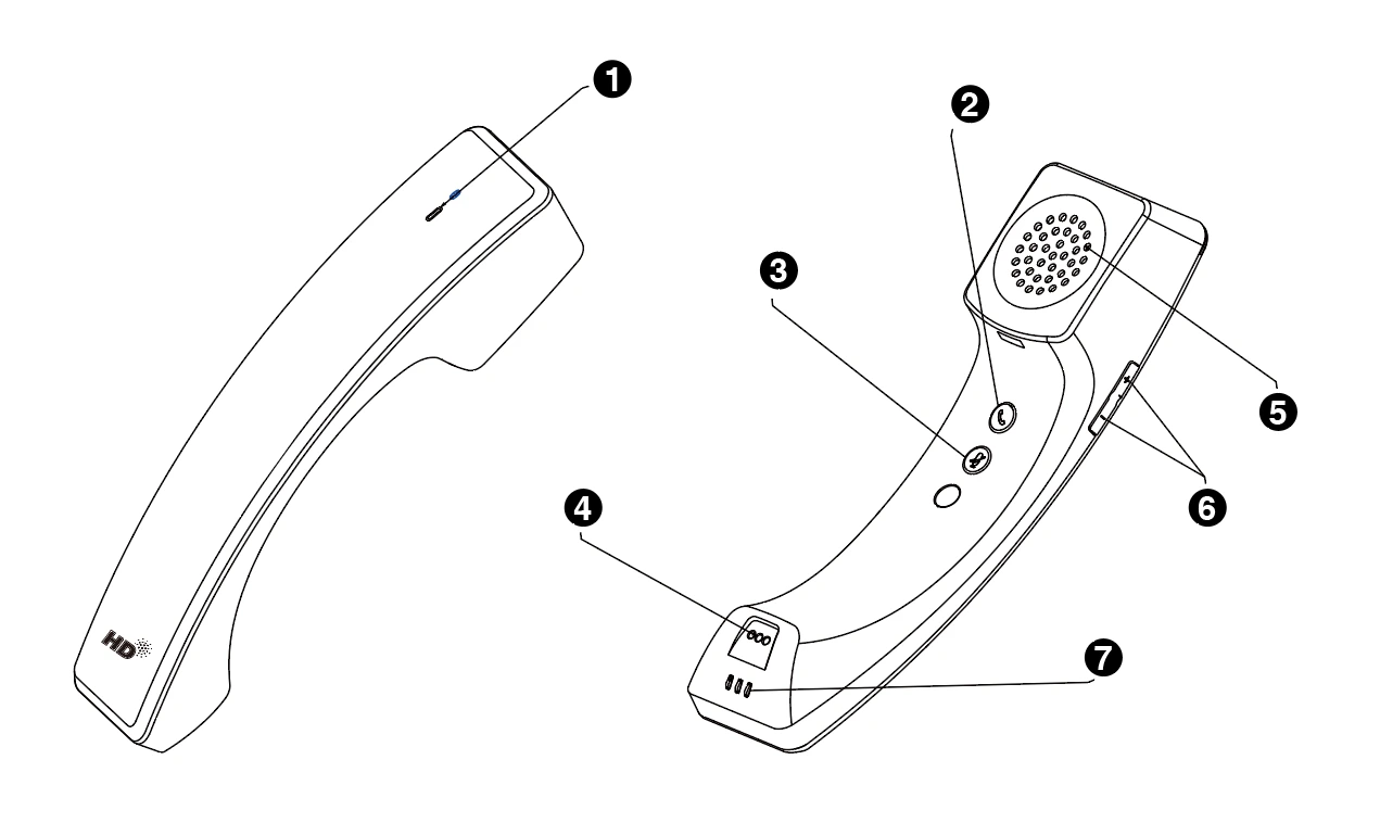 | 2 | Phím Hookswitch | – Trả lời/Từ chối/Kết thúc cuộc gọi. – Nhấn giữ 3 giây để bật tay cầm. – Nhấn giữ 8 giây để tắt tay cầm. |